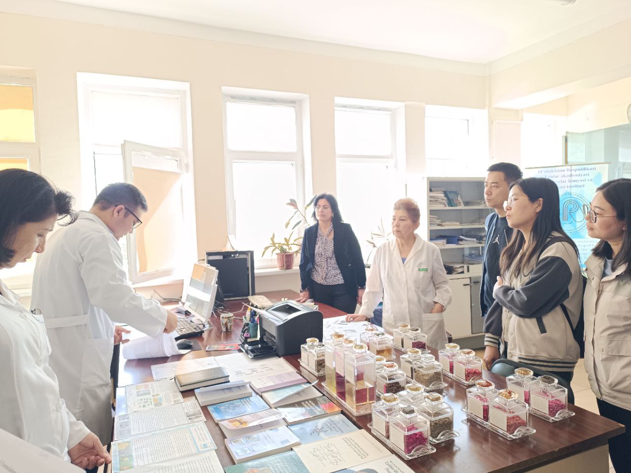 Tashrif davomida Institutda olib borilayotgan istiqbolli ilmiy tadqiqotlar bilan tanishish va malaka almashinish rejasi ham ko’zda tutilgan. Shu munosabat bilan tashkil etilgan ilmiy seminarda Institutdagi laboratoriyalar va olib borilayotgan izlanishlar, jumladan, tabiiy polimerlar asosidagi biofaol, ekologik xavfsiz preparatlar haqida taqdimot qilindi. Shuningdek, xitoylik professorlar Jia Xiaochen, Li Tang va Xie Hongguo Xitoy Fanlar Akademiyasi DKFI da oligo- va nanopolisaxaridlar hamda ular hosilalarining asosidagi agropreparatlar va ularning ta`sir mexanizmlarini tadqiq etish bo`yicha ma`ruzalari tinglandi. Chet ellik olimlar Institutda olib borilayotgan ishlar bilan tanishib, o`zaro fikr almashtirishdi, muhokamalarda yosh olimlar faol qatnashishdi.
